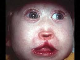 * Sordera, fisura del paladar, labio leporino, microcefalia, anoftalmia (falta del globo ocular), microftalmia (ojos mas pequeños de lo normal), hipotelorismo (ojos muy juntos).